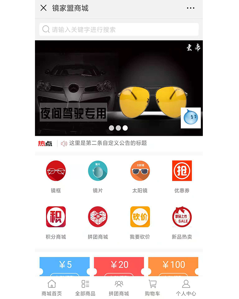 該應(yīng)用是專為眼鏡愛好者的購物公眾號,設(shè)計開發(fā)積分商城、拼團、砍價等功能模塊。