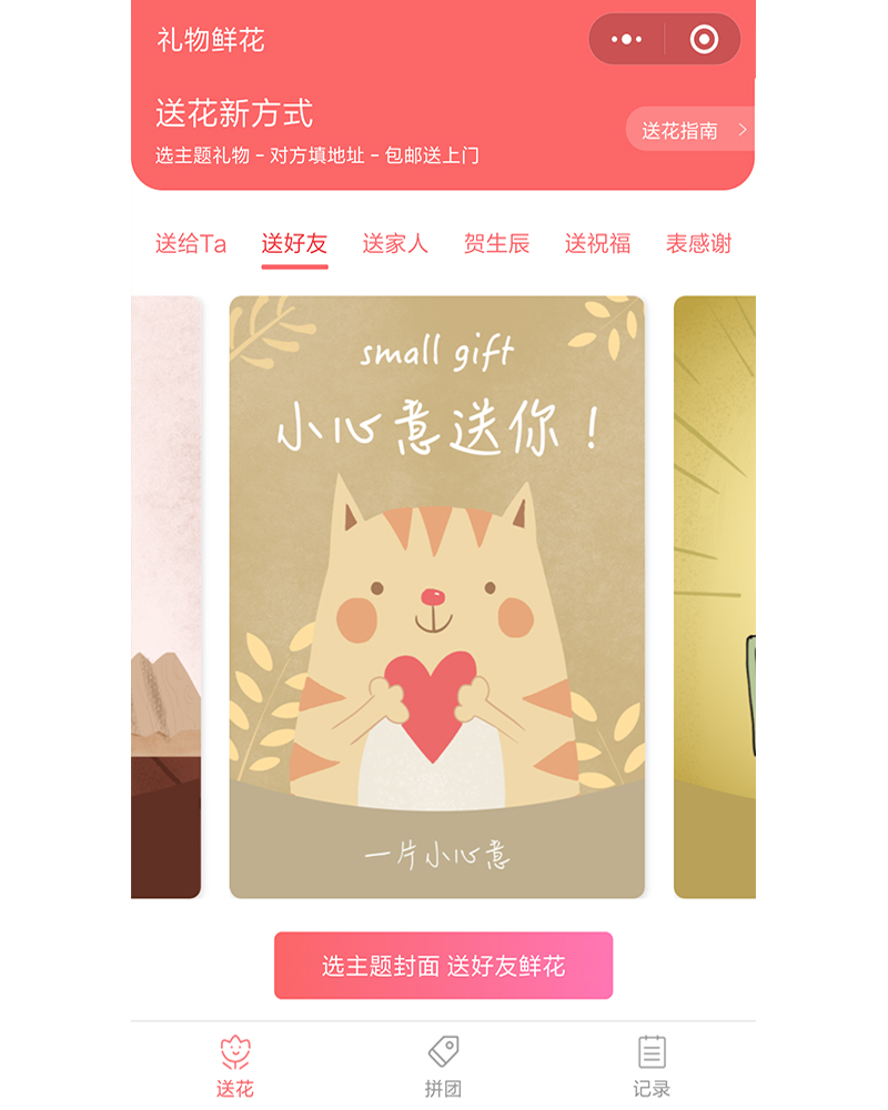 該微信公眾號是專業(yè)的鮮花網(wǎng)絡(luò)購物平臺,應(yīng)用開發(fā)功能模塊有首頁、拼團、記錄等等。